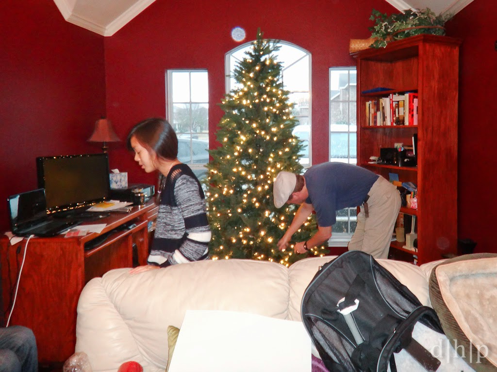 We are off to the movies (with Fandango tickets) first thing this morning when I notice that we have a text from Jason asking if we want to help them decorate their tree. Well, dang - how can we make this happen? We make a quick trip to the theater to find out if we can switch our tickets for another day and as amazing as it seems, we can. So cool. We reroute toward Jason's in no time and find that they have a new tree to put up. Mister opens the box to find a pre-lit tree in three simple pieces and quickly has it ready to decorate.