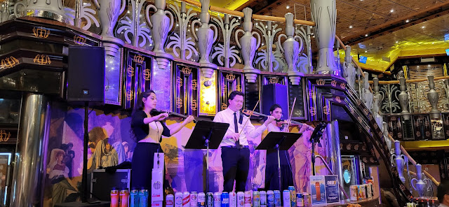 We stop off at the Atrium bar, meet Emmanuel and Vera - great bartenders. Some fabulous string music by Soul String Trio. I tried to buy some of their music, but couldn't find them online - sometimes they are listed as the Accidental String Trio, but still no cds. Too bad, they were amazing. Their rendition of Stairway to Heaven had Mister impressed as well.